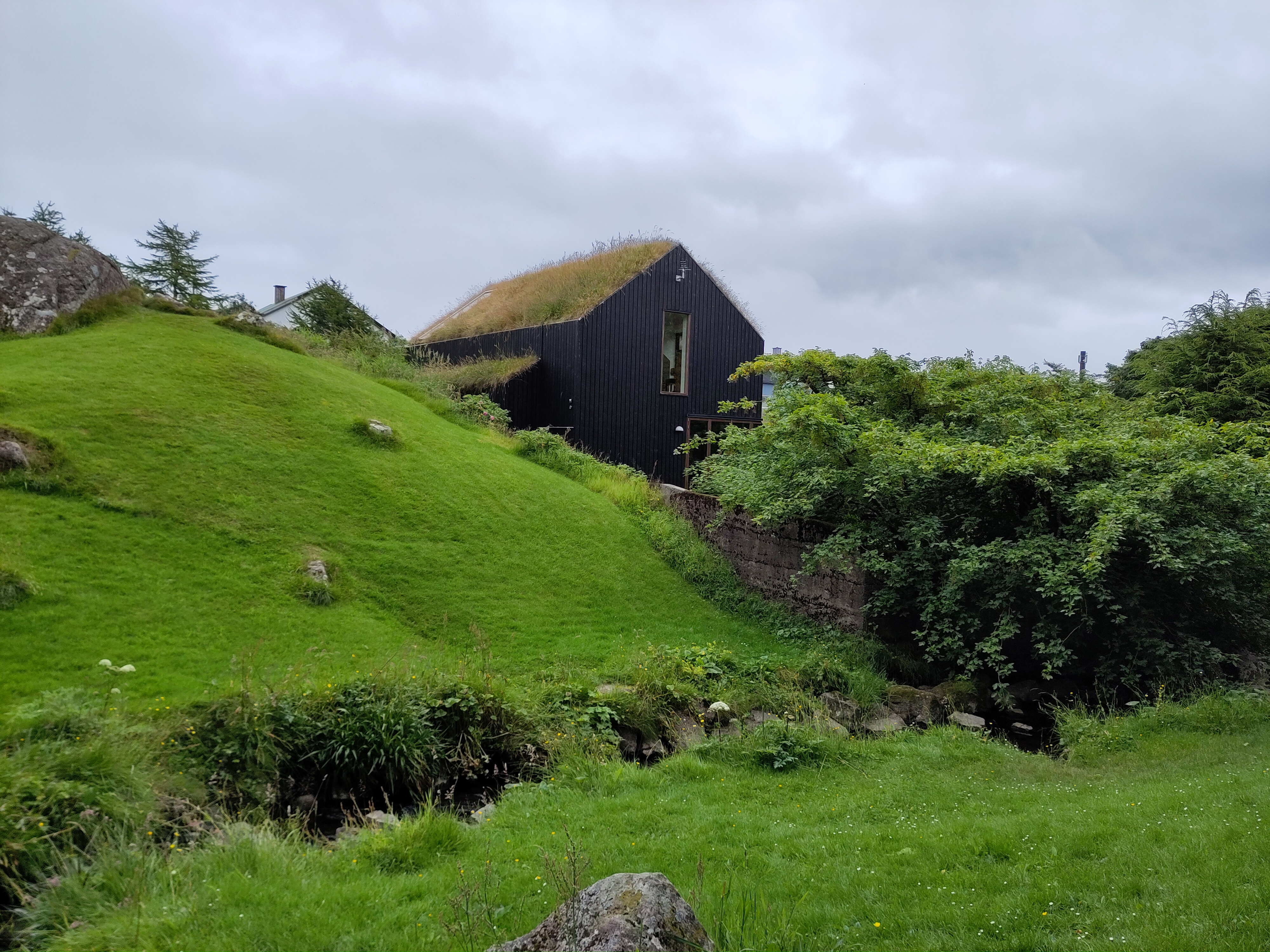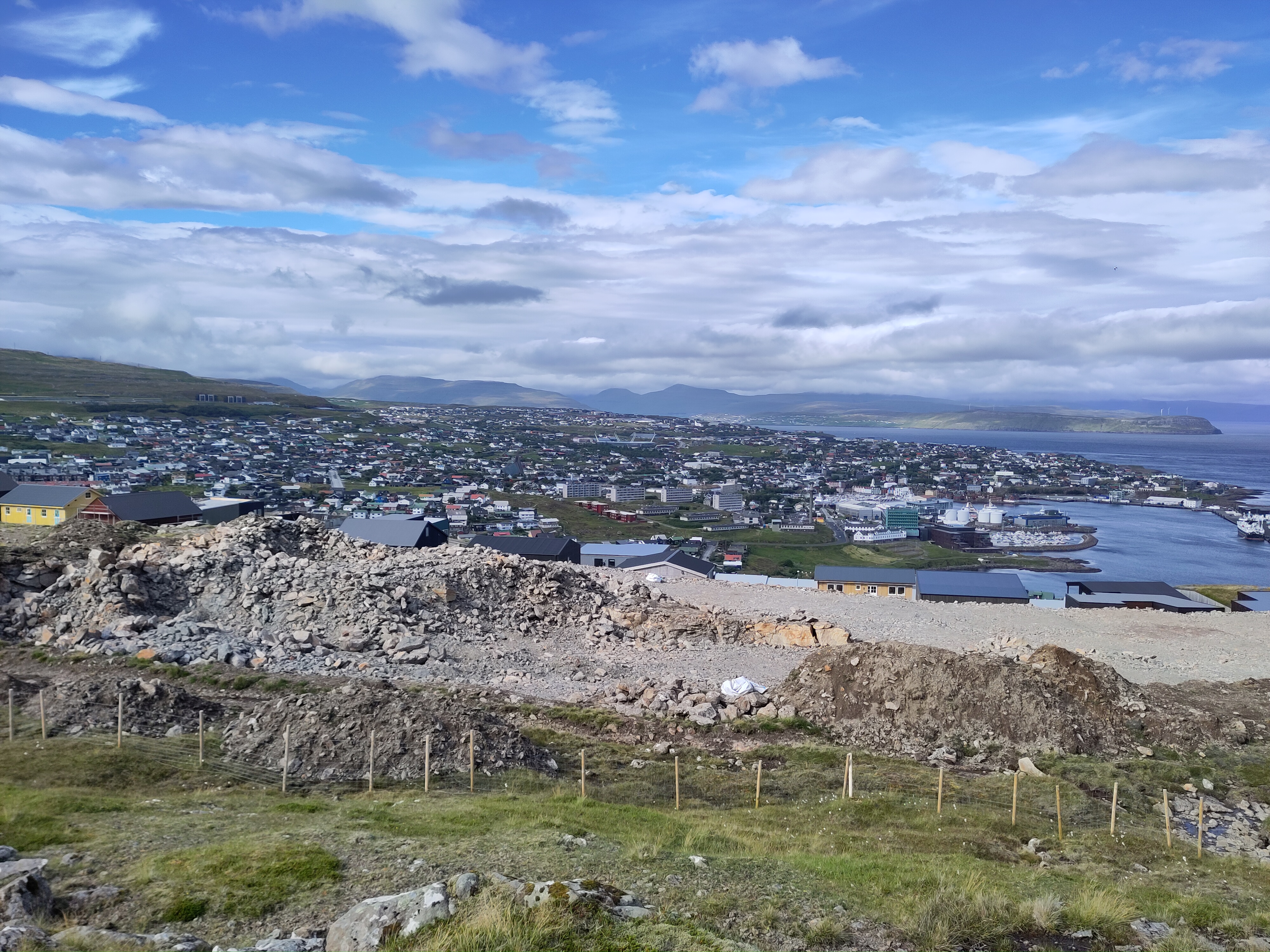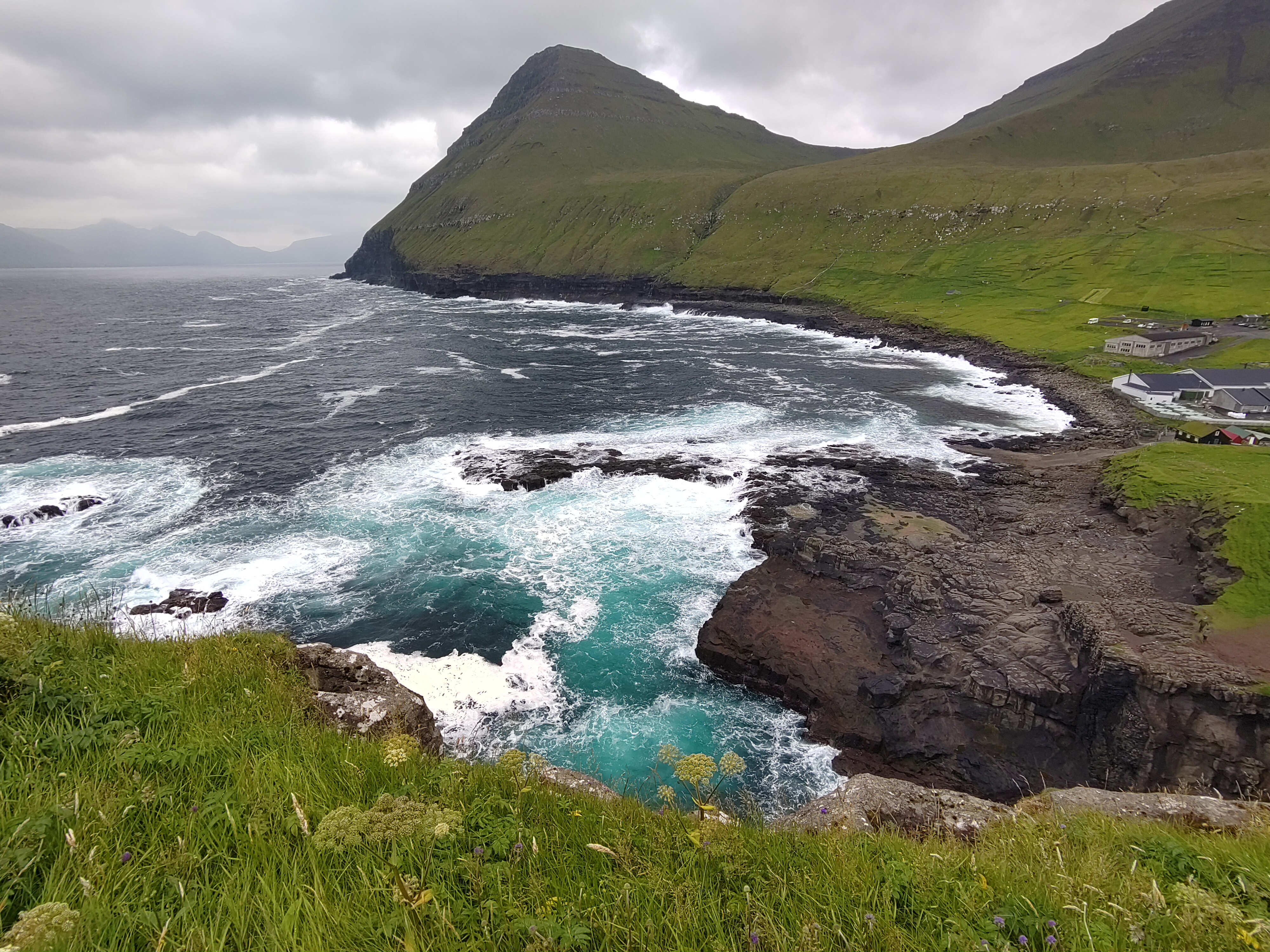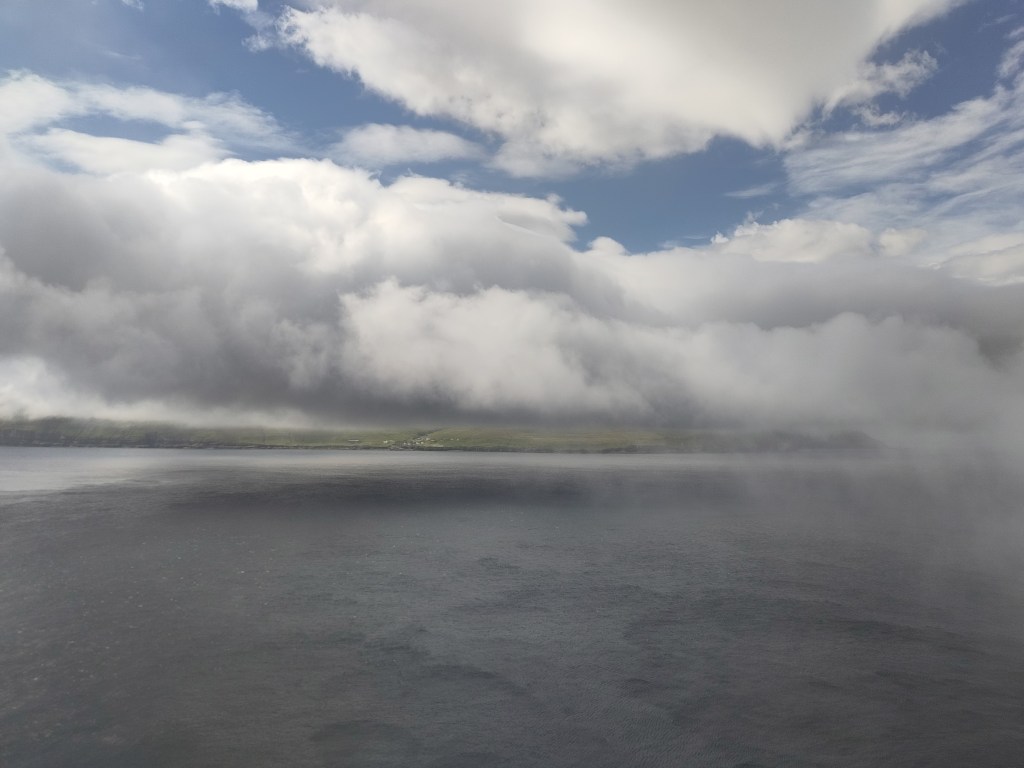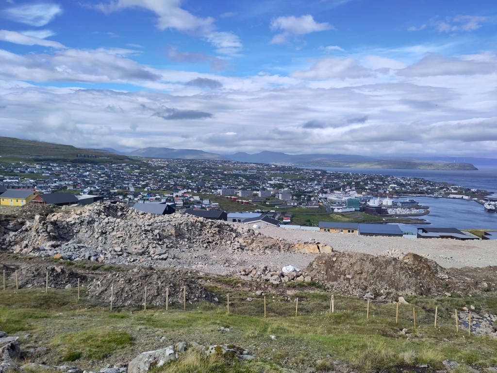 Ein Geheimnis, dass auch die von mir befragten Einheimischen nicht lüften konnten, ist die Geschichte dieser kleinen Grashöcker zwischen Dalur und Skavanes. Dafür habe ich erfahren, dass die Geburtenrate hier bei fast 3 Kindern pro Frau liegt, was erklärt, warum so viel gebaut wird. Und was wohl mit der Religiosität und der sehr traditionellen Rollenbilder zu tun hat. Neben der staatlichen Kirche gibt es unzählige Sekten und einer der 3 wichtigsten Radiosender ist ein christlicher, ich kenne ihn schon gut… Vor ein paar Tagen war eine Frauengruppe in Röcken mit mir auf der Fähre zur Insel Hestur. Als ich den wie immer steilen Hang hinter dem Dorf hoch gestiegen bin, sah ich sie unten im Dorf von Haus zu Haus huschen. Und am nächsten Tag bekam ich die Gewissheit: eine der Frauen war bei meiner Torshavner Gastgeberin zu Besuch – für eine Diskussionsrunde und Bibel Lesung der Zeugen Jehovas.