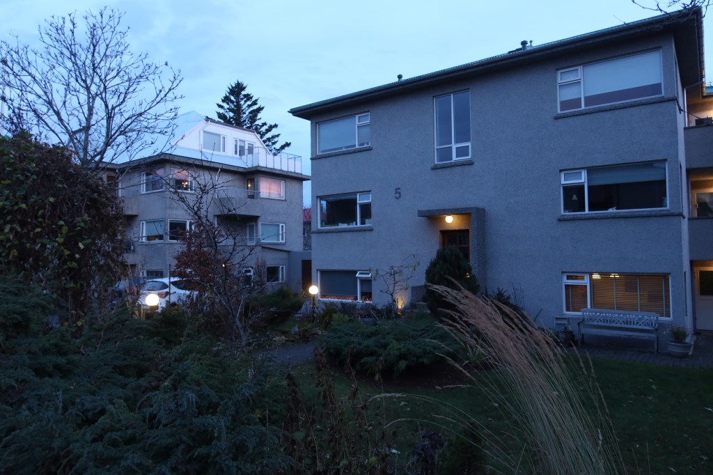 Blick aus dem Wohnzimmer meiner Gastgeberin auf die morgendliche Strasse. Es ist fast 9:30, langsam ahne ich, wie dunkel es noch werden kann… / typisches Wohnhaus mit schlichter , schöner Innenarchitektur und sehr gemütlichen Wohnungen Inzwischen ist es gegen 10:30 und ich schaue von der Hallgrimmskirkja Richtung Hafen. Die Häuser der Altstadt sind oft mit buntem Wellblech verkleidet, das die Isolation schützt. Hier gibt es schöne Ecken und gemütliche Cafés